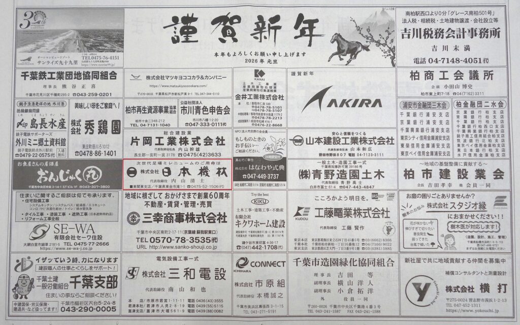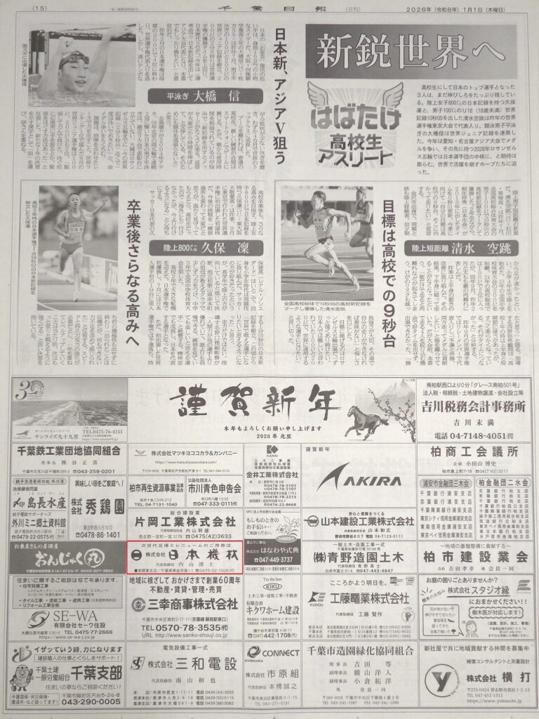 1月1日(木)の千葉日報に当社広告が掲載されましたのでお知らせ致します。 千葉県にあります各企業様とともに、新年挨拶広告を掲載させていただいております。 今年も皆様にとって希望に溢れる一年となりますよう、お祈り申し上げます。